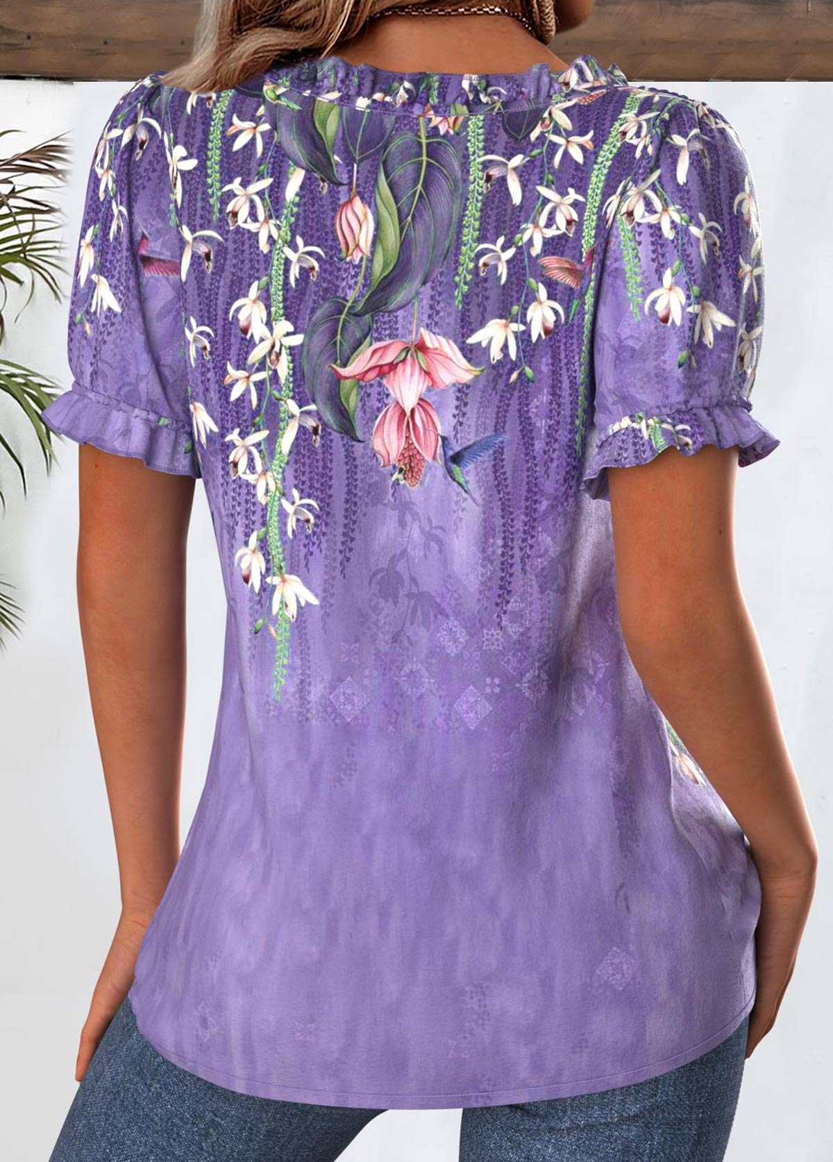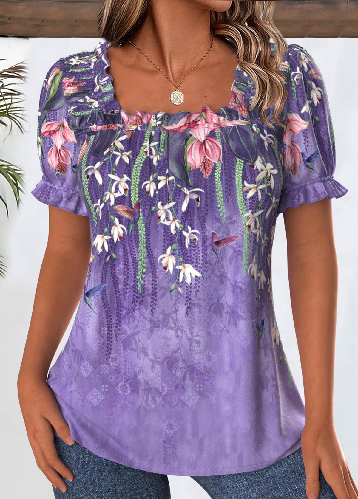 Purple Floral Print Short Sleeve Square Neck Blouse