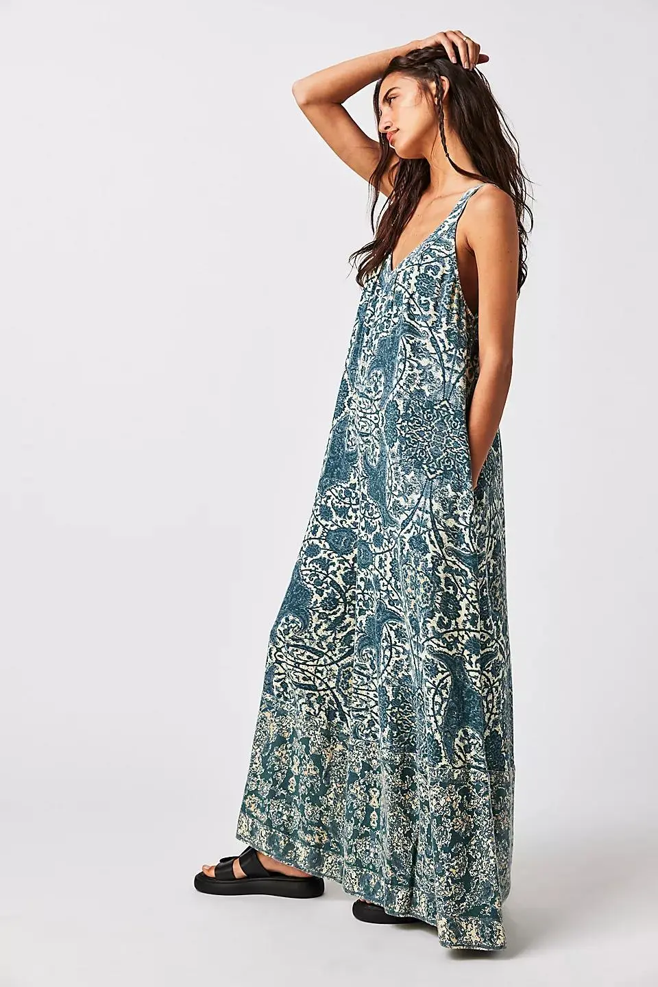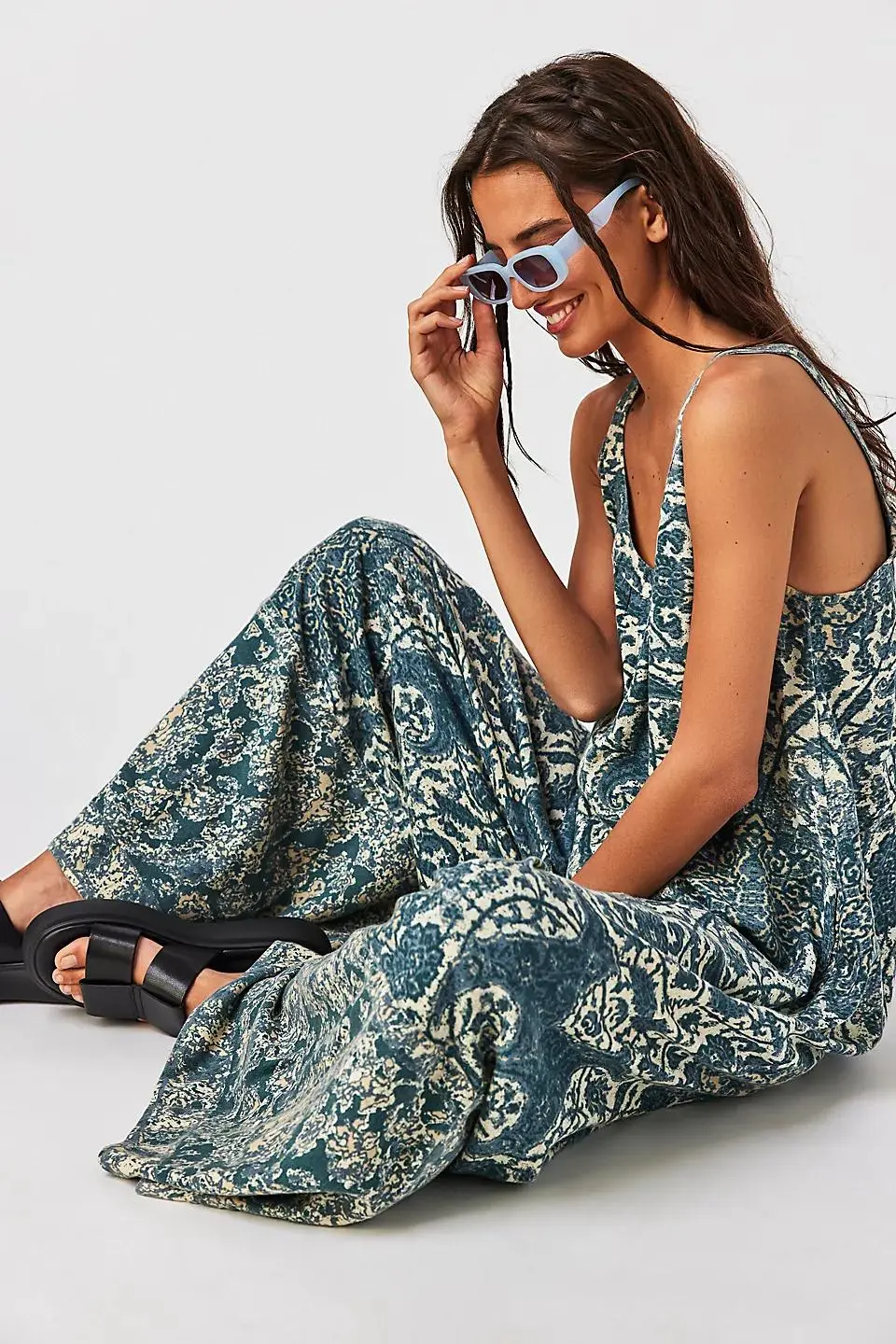 So free and flowy, this effortlessly essential one piece is featured in the perfect printed design with super wide legs for added shape. **Fit:** Relaxed, shapeless fit **Features:** Scoop neckline, dropped armholes, side pockets, pleating at bust, contrast bottom hem **Why We