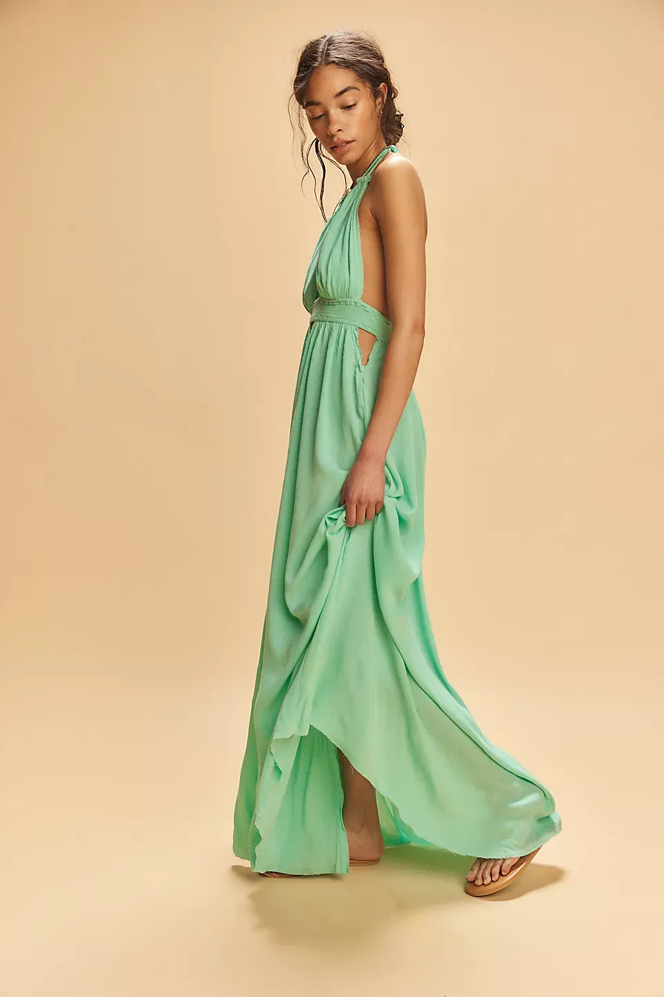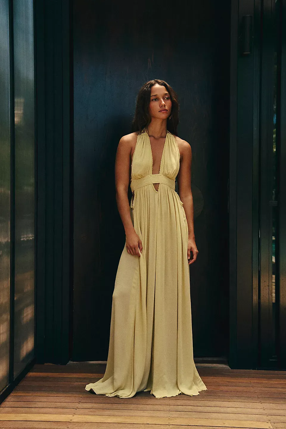 Sun goddess maxi in a crinkly crepe with a deep V-neck, adjustable rope halter, and stretchy smocked empire waist with geo cutout detailing below. Raw edges. We love tying the slit, and creating a knotted hem to change up the look.