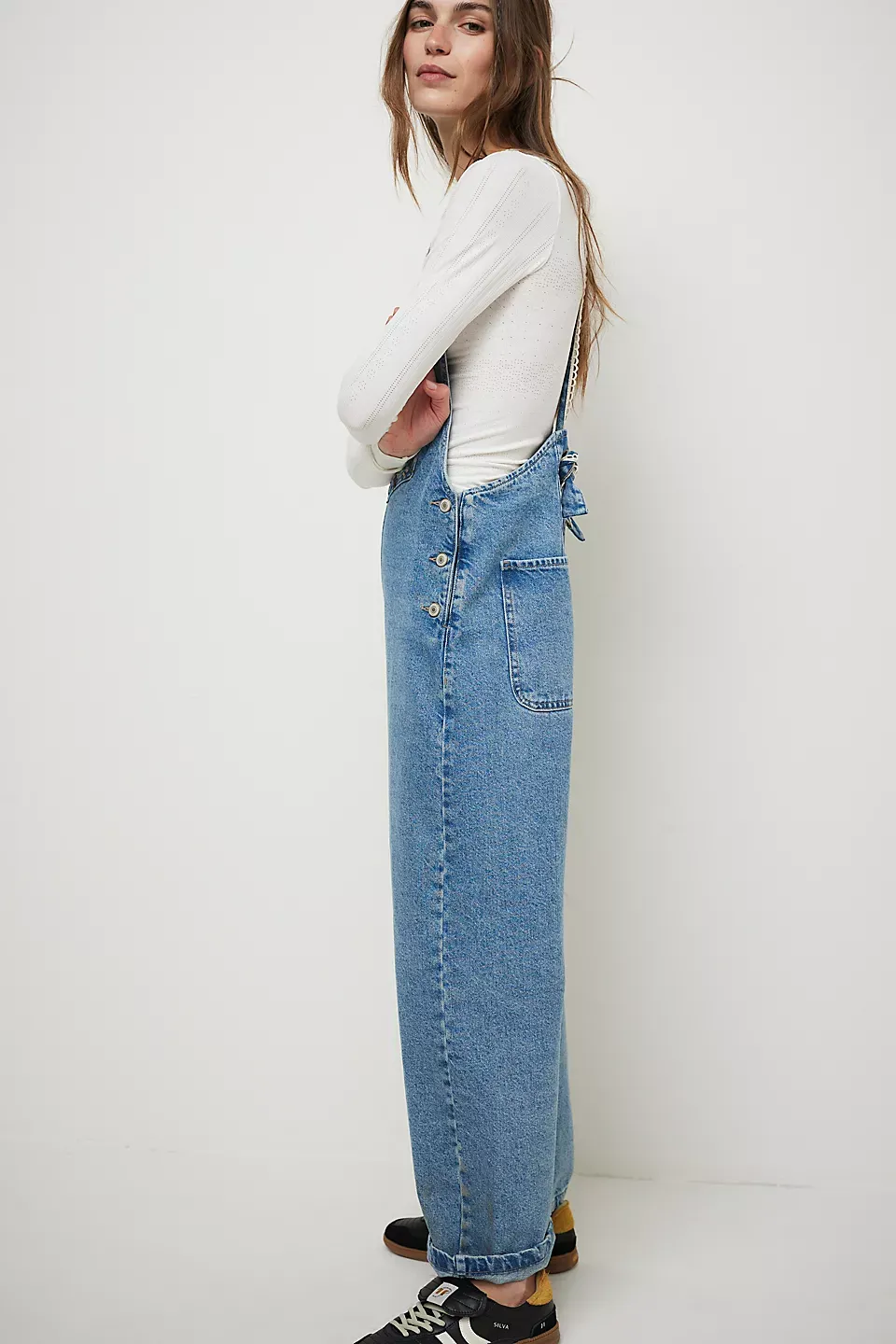 Classic meets crafty in these one-of-a-kind overalls from our We The Free collection.**Fit:** Classic bib-and-brace silhouette with relaxed fit  **Features:** Embroidered front pocket feature, adjustable knotted straps, side button closures, pockets throughout  **Why We ? It:** Toughened up with moto boots or off-duty with slip-on mules, this pair has endless ways to wear.