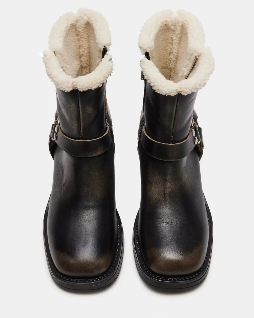 The BRIXTON faux shearling moto  keeps you comfortable no matter what your day has in store for you with a wide square toe sole, an easy block heel, and a super-soft faux shearling interior. Adjustable straps with chunky metal hardware add a little edge to the look and give you a customized fit.