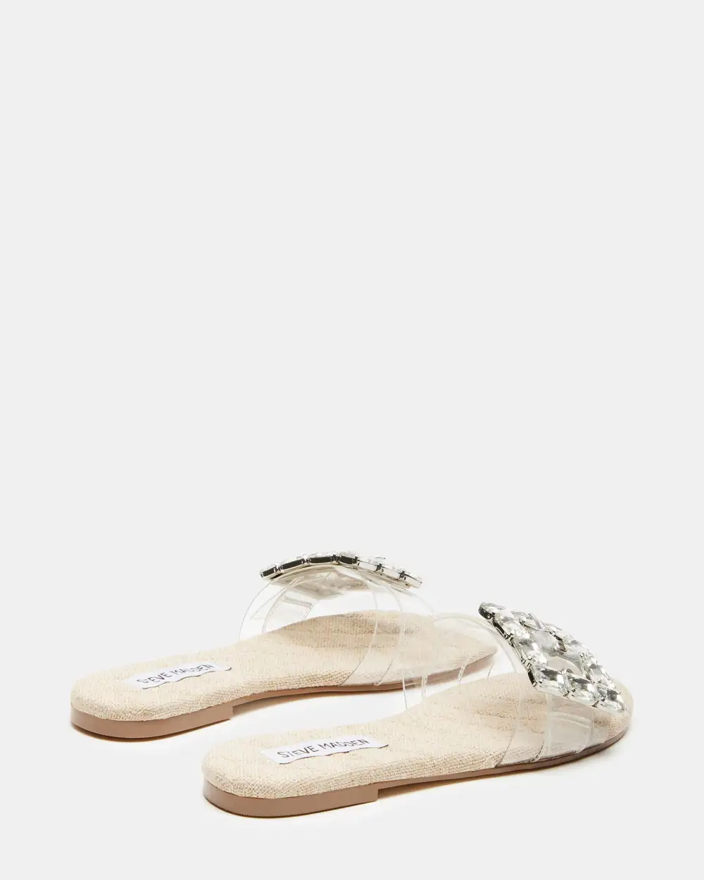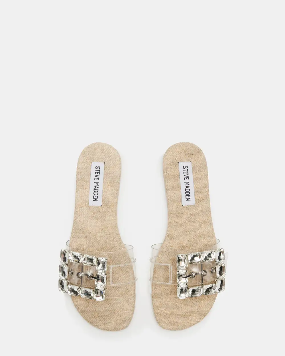 A chunky rhinestone buckle on the strap of the MARIKA adds a moment of sparkle to an easy flat look.