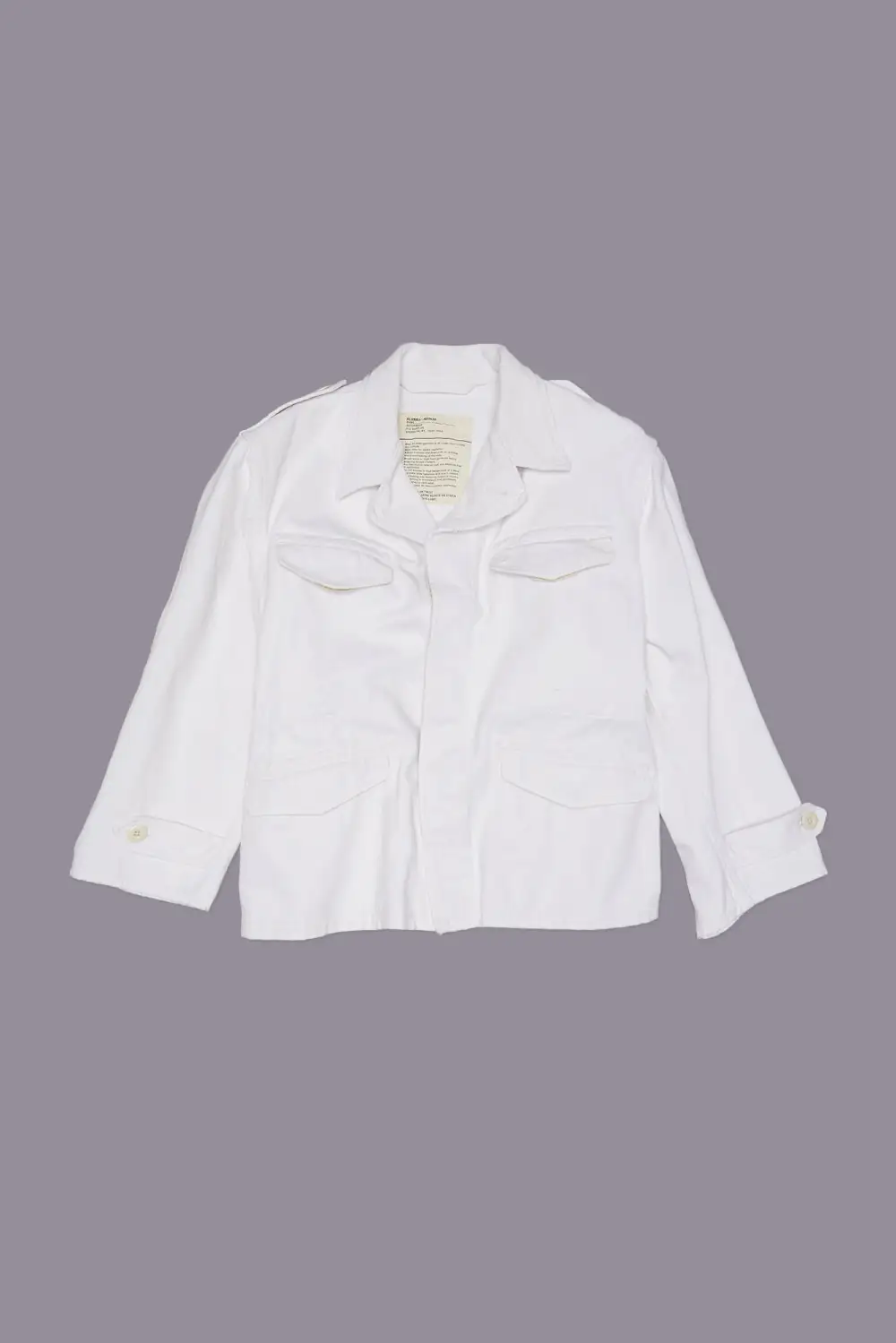 Boxy army jacket featuring cropped sleeves and a heavy cotton construction.